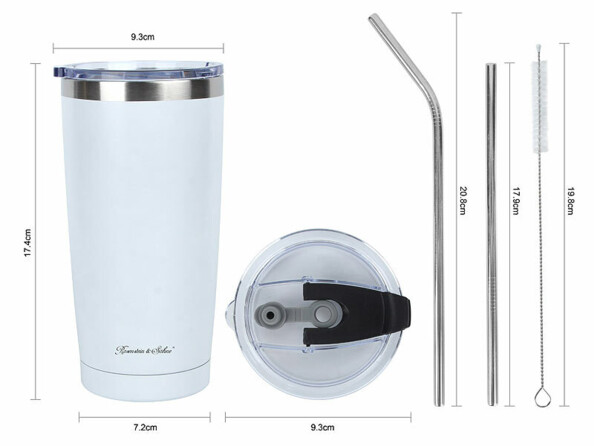 - Gourde isotherme double paroi avec 2 pailles, brosse de nettoyage pour pailles, 2 couvercles, brosse de nettoyage pour gourde et mode d’emploi en français