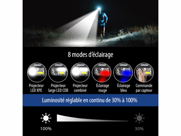 - 4 modes différents : LED XPE, LED COB, lumière rouge ou lumière clignotante