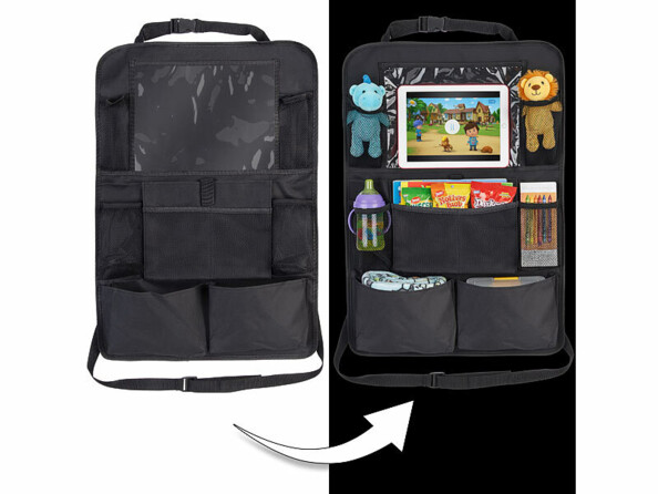 Huit poches pour voyager en groupe : les poches de différentes tailles accueillent les affaires de chacun, qu'il s'agisse des jouets ou livres de vos enfants, de vos habits, de vos sandwichs ou encore de votre tablette ou iPad. En outre, les compartiments sont faciles d'accès grâce aux fermetures à scratch, et retiennent vos affaires en cas de freinage brusque. Grâce à l'organisateur, vous transformez vos sièges avant en rangement pratique !