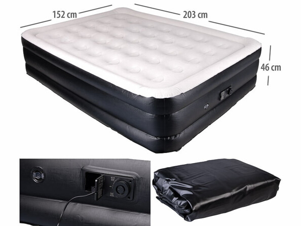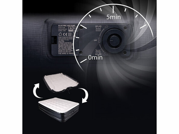 Un grand confort en un clin d'œil : ce matelas pneumatique avec pompe à air électrique vous permet de dormir n'importe où ! Servez-vous en comme lit d'appoint pour un invité, comme matelas de plage, etc. Grâce à la pompe à air électrique intégrée, le matelas se gonfle facilement et rapidement ; vous pouvez vous allonger en un clin d'œil ! Après utilisation, il est tout aussi facile à dégonfler et ranger. La pompe à air intégrée gonfle complètement le matelas en 5 minutes environ, et le dégonfle de façon tout aussi automatisée.