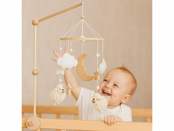 Fabriqué en bois, ce mobile séduit par son toucher et son aspect naturels. Le matériau est lisse et sans arêtes vives, ce qui le rend idéal pour une utilisation dans l'environnement de votre enfant. Que ce soit au-dessus du lit bébé, de la table à langer ou simplement comme détail chaleureux dans la chambre d'enfant, son design discret avec des étoiles s'intègre dans presque tous les styles d'intérieur.