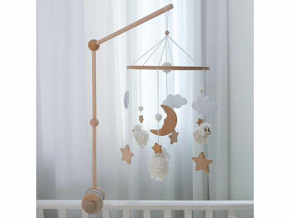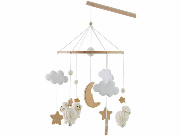 Décorez le lit de bébé avec ce joli mobile et ses motifs en bois