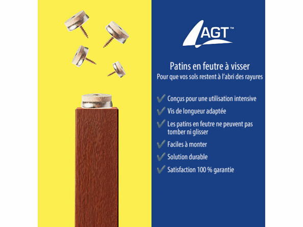 Les patins en feutre sont équipés de vis pour une fixation simple et sûre. Ainsi, ils restent bien en place même après de nombreuses manipulations, contrairement à des patins autocollants.