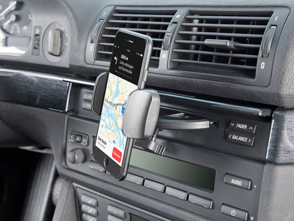 Fixez votre iPhone, smartphone, téléphone ou GPS de façon sûre et maline : profitez de la prise offerte par le lecteur CD de votre voiture.