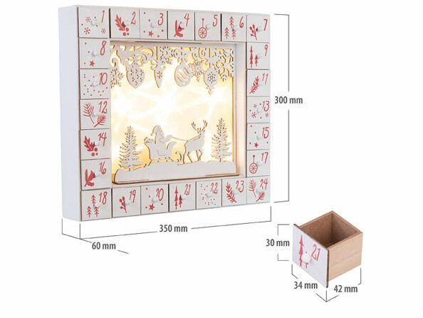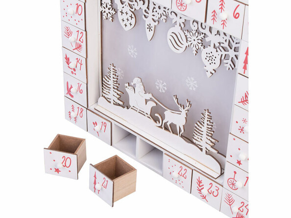 Les 24 petites portes forment un cadre élégant autour du motif. Chacune d’entre elles est un petit tiroir que vous pouvez remplir à votre guise avec des chocolats, des petits jouets, des cosmétiques ou des messages personnels. Comme ils peuvent être placés librement dans le cadre, une nouvelle séquence de chiffres est créée chaque année, et la recherche quotidienne du bon compartiment reste passionnante.