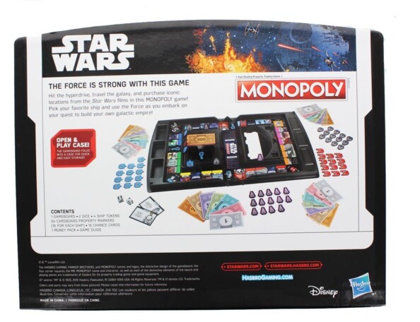 Cette version simplifiée du célèbre jeu de gestion Monopoly est totalement dédiée à ces vaisseaux spatiaux qui nous font rêver dans tous les films Star Wars : sur un plateau plus court, votre enfant apprend la gestion dans le monde de l'Empire Galactique, avec un des 4 pions-vaisseaux, les classiques billets de banque et de cartes d'actions. Très malin, ce plateau de jeu n'est pas rangé dans une boîte, mais c'est la boîte elle-même qui est une mallette pouvant s'ouvrir et se fermer rapidement pour emmener ton Monopoly partout et lancer une partie en quelques secondes, lors d'une après-midi ou une soirée sous les étoiles !