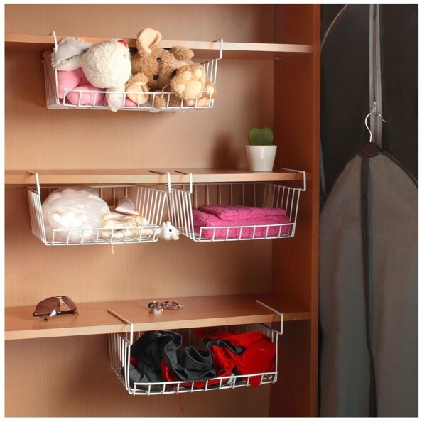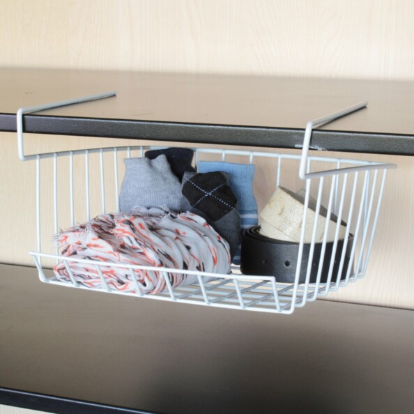 Cette corbeille possède deux crochets à glisser sous une étagère, planche ou toute autre surface. Ainsi placée, ce panier peut accueillir vos affaires, vous offrant d'avatange de place.