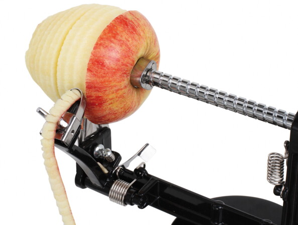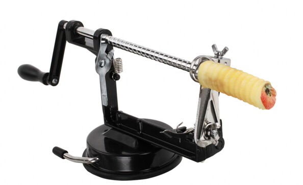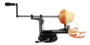 Il vous suffit de placer la pomme sur l'appareil, de tourner la manivelle pour qu'une lame enlève proprement l'épluchure de la pomme et qu'une deuxième lame la découpe en spirale.