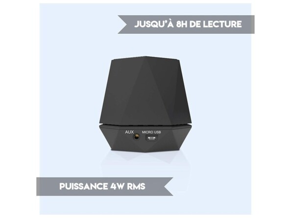 - Contenu de l'emballage : 1 enceinte, 1 câble micro-USB, 1 câble audio jack 3,5 mm