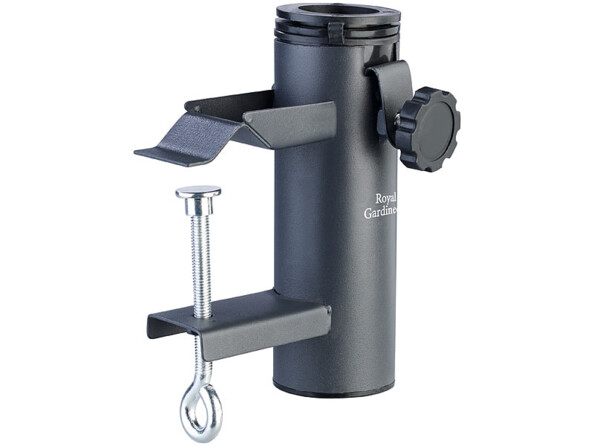 Grâce au support de parasol universel en métal avec adaptateurs Royal Gardineer, accrochez votre parasol à une clôture ou une rambarde ! Son installation est rapide, facile et ne nécessite pas de perçage : fixez le porte-parasol en acier robuste en un tour de main à une table, une balustrade ou une clôture par le biais de l'étau, et profitez des belles journées d'été à l'ombre. Le support convient également pour un étendoir à linge ou un mât de drapeau.