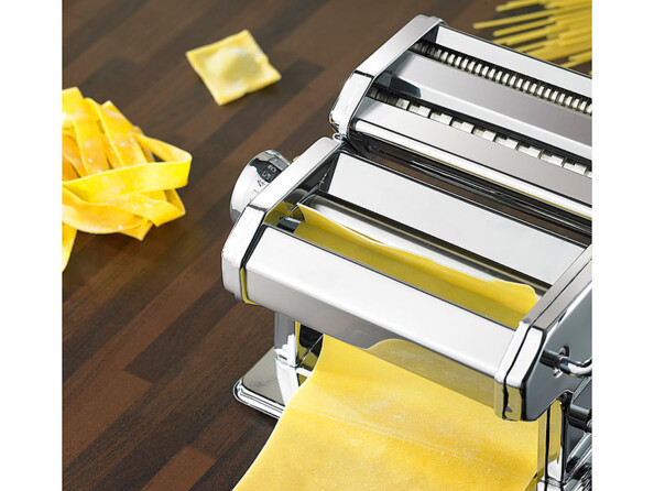 Stable grâce à son étau pour table et plan de travail, le laminoir Rosenstein & Söhne vous permet soit de tirer de bandes de pâte régulières pour des lasagnes, soit de tagliatelles de 2 ou 7 mm, au choix.