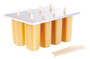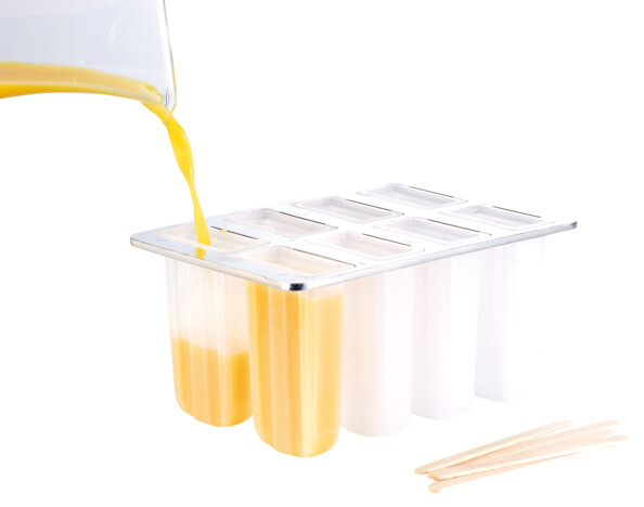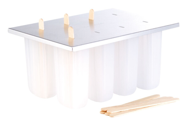 Il suffit de remplir les 8 emplacements de ce moule pour glace à eau avec la préparation de votre choix : sirop, jus de fruit ou yaourt, puis d’insérer un bâtonnet en bois avant de placer le tout au congélateur.