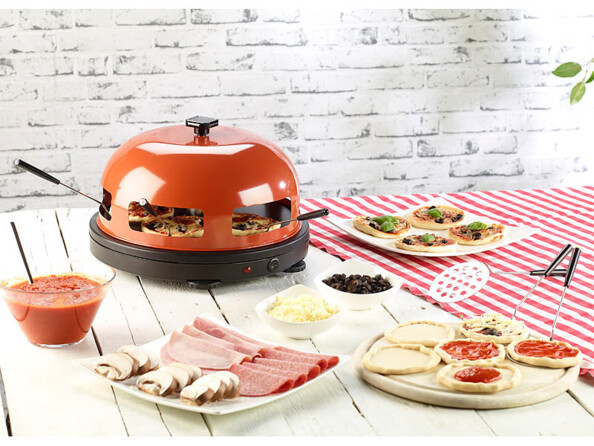 Cette version italienne et originale de la raclette permet à chacun de préparer sa pizza selon ses goûts. La classique au fromage, jambon et poivrons ou la version plus exotique avec du saumon, des crevettes et de l'ananas, ce four convient aux plaisirs les plus variés.