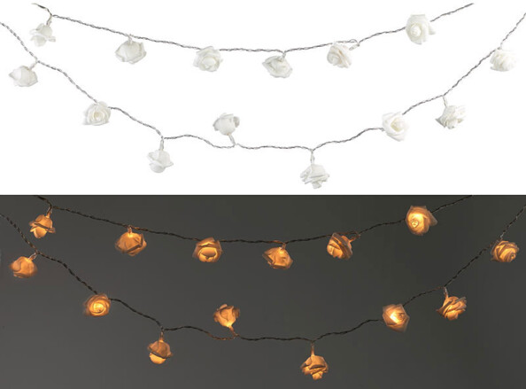 Cette guirlande florale s'allume automatiquement à la tombée de la nuit grâce au capteur de luminosité.