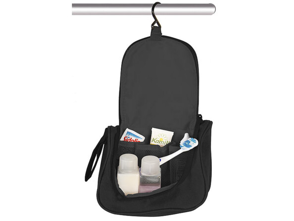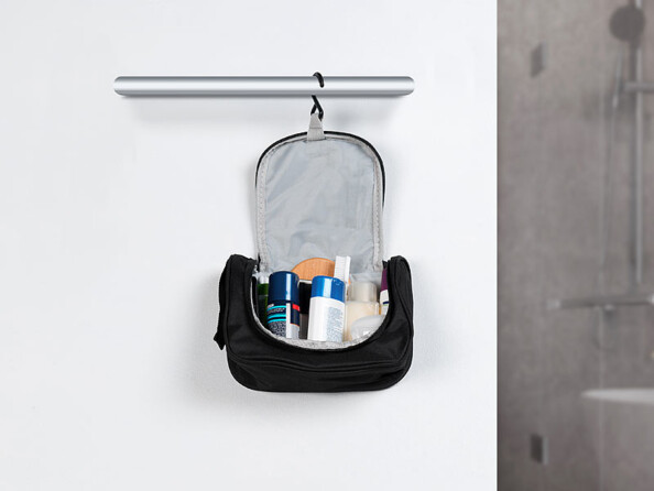 Mais l'atout majeur de cette trousse de toilette réside dans le crochet intégré. Celui-ci permet d'accrocher la trousse de toilette en hauteur. Ainsi vous libérez de la place dans la salle de bains, et vous avez un aperçu complet sur son contenu.