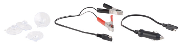 - Branchement sur prise allume-cigare 12V avec câble adaptateur, ou directement sur la batterie avec câble à pinces