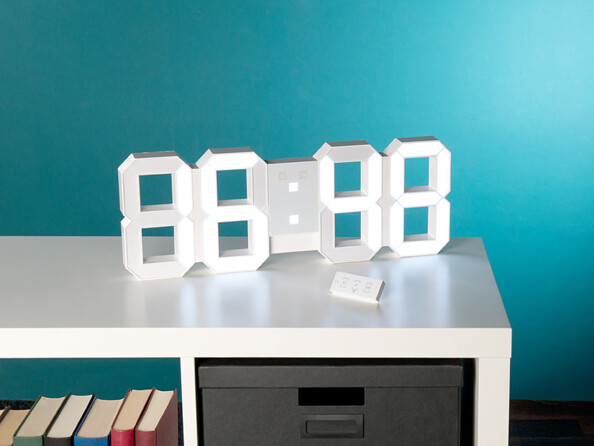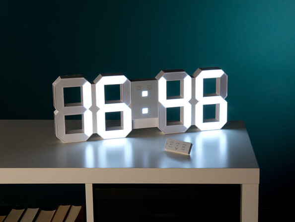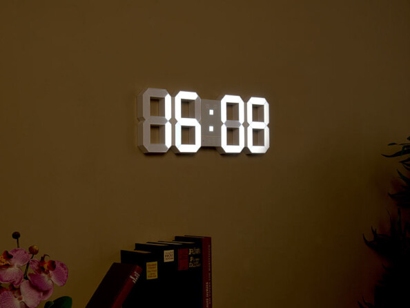 L'heure s'affiche en chiffres lumineux qui semblent flotter dans l'obscurité. Fixée au mur ou simplement posée sur un meuble, cette horlogeaffiche l'heure de manière bien lisible, même de loin. C'est idéal pour un bureau, un salon, une cuisine, et même pour votre chambre : vous pouvez faire varier l'intensité de l'éclairage, pour que celui-ci ne gêne pas votre sommeil. Pratique : l'horloge sert également de réveil.