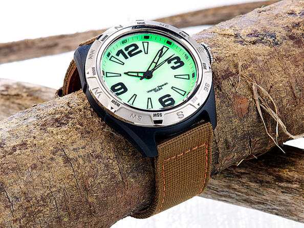 Son bracelet en tissu résistant et l’imitation de la boussole sur la lunette en font un accessoire sportif ultra moderne.