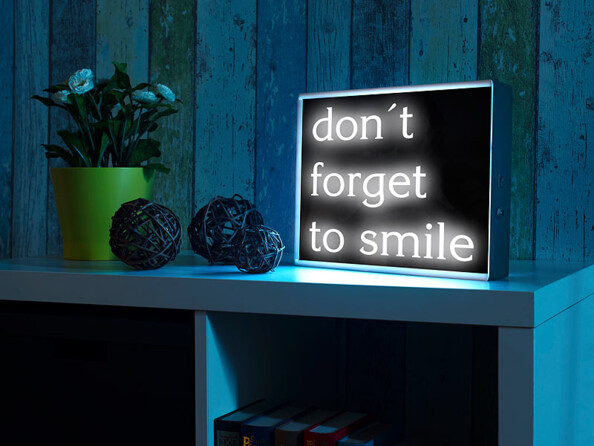 Imprimez vos messages sur des transparents, des papyrus ou du papier et insérez-les simplement dans la boîte. Laissez votre génie s’exprimer et créez vos propres designs. Surprenez vos invités en leur souhaitant une agréable bienvenue ou présentez le menu du jour à vos clients. Vous pouvez même projeter vos photos de vacances.
