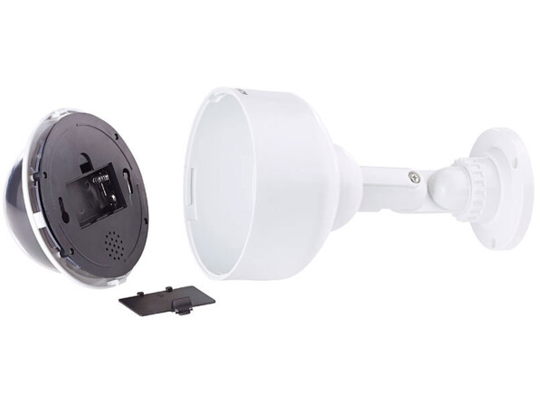Fixée à un mur grâce au support mural intégré, elle ne se distingue pas d'une vraie caméra.