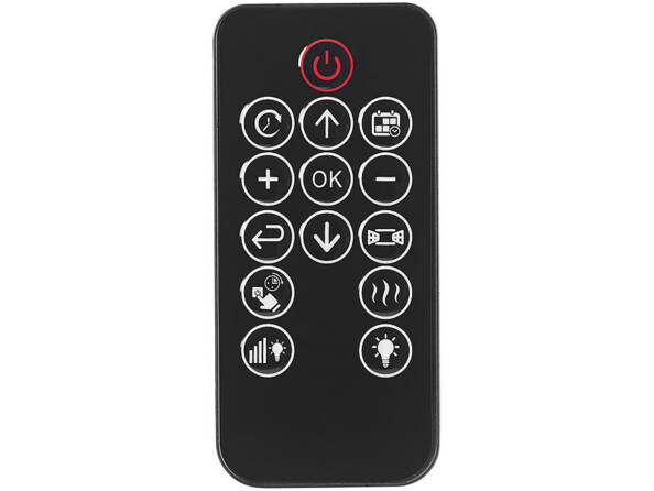 - Télécommande claire : minuterie hebdomadaire pour jusqu'à 10 plages horaires et jours réglables, chauffage commutable, température réglable de 15 - 40 °C, effet flamme commutable et réglable en taille, rétroéclairage, détection de chute de température, etc.