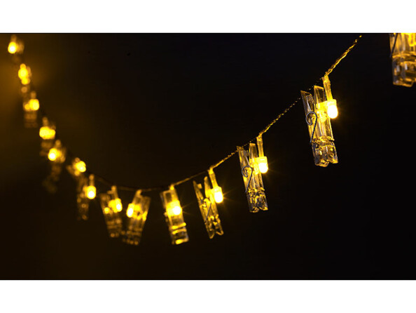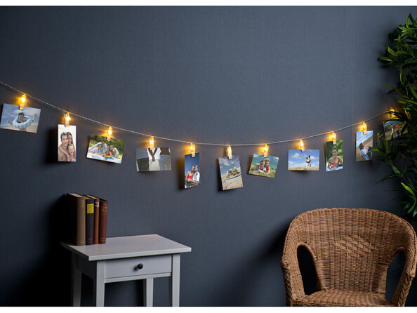 Gardez vos plus beaux souvenirs toujours bien en vue : photos de groupe, dessins de votre petit bout de chou ou cartes postales venues de l'autre bout du Monde. Avec ces 40 pinces LED, la guirlande apporte touche à la fois lumineuse et chaleureuse à votre pièce. Alimentée par un boîtier à piles, vous pouvez facilement la disposer : sur un mur avec un peu d'adhésif, sur un meuble ou même sur le sapin de Noël, pour une décoration vraiment très personnelle !