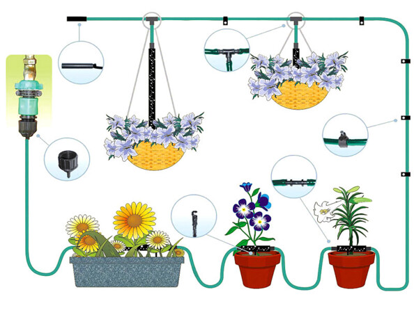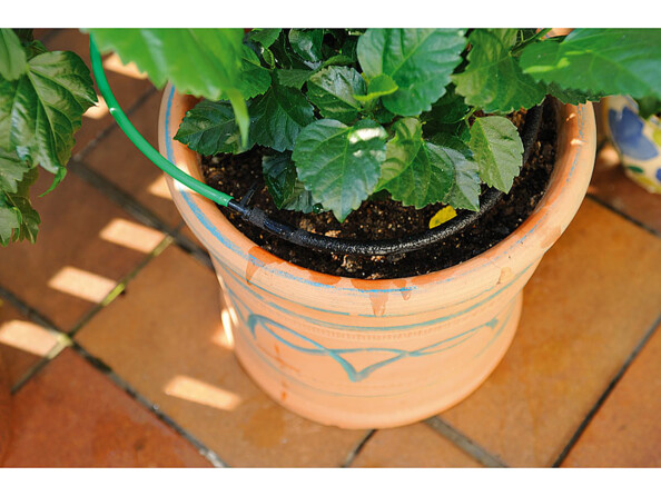 Utilisez ce sytème automatique pour arroser les plantes de votre véranda ou de votre balcon. Branchez le tuyau étanche du système d'arrosage au programmateur Royal Gardineer. Placez une section du tuyau d’irrigation dans chaque pot de fleur. Il suffit ensuite d’ouvrir le robinet pour que l’eau passe dans votre système d'irrigation sur mesure.