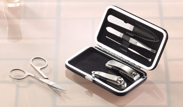 - Pack de 2 trousses avec 2 ciseaux à ongle, 2 limes, 2 pinces à épiler, 2 pousses cuticules, 2 coupe-ongles et 2 coupe-peau