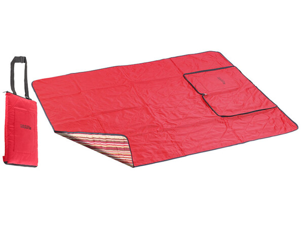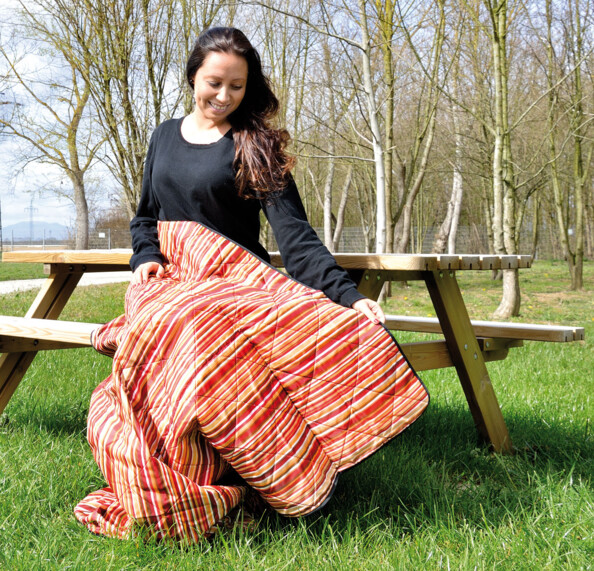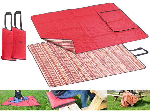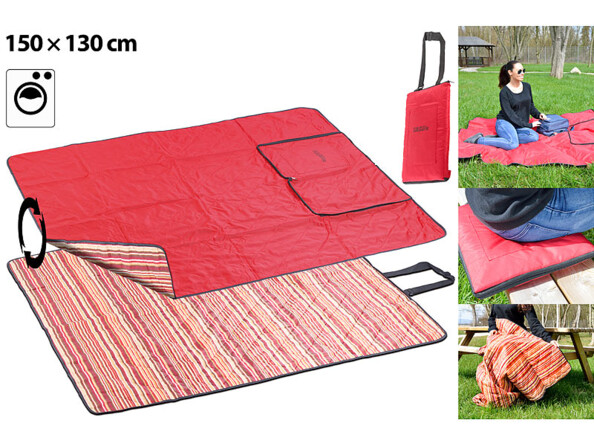 Pratique : en un tour de main la couverture se transforme en coussin, qui vous permettra de vous assoir sur un banc de pique-nique par exemple. Ainsi repliée, la couverture se transporte facilement, en la portant en bandoulière. Et lorsque le temps se rafraichit, utilisez la couverture pour vous couvrir, et profitez ainsi pleinement de la vie au grand air !