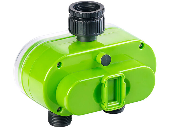 Branchez le programmateur d'arrosage directement au robinet. Grâce aux 2 raccords pour tuyau d'arrosage, vous pouvez arroser 2 parties de votre jardin de manière indépendante l'une de l'autre. Le programmateur d'arrosage est particulièrement pratique lorsque vous partez en vacances : votre pelouse reste verte même pendant votre absence !