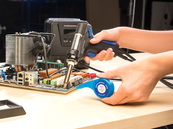Pour dessouder en bonne et due forme : chauffez les soudures avec votre panne à souder et récoltez les brasures avec le fil de cuivre pour un résultat propre.