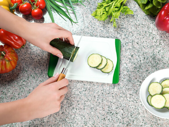 Coupez par exemple les fruits sur la planche jaune, les légumes sur la verte, la viande sur la rouge, etc. pour ne pas dénaturer leur saveur.