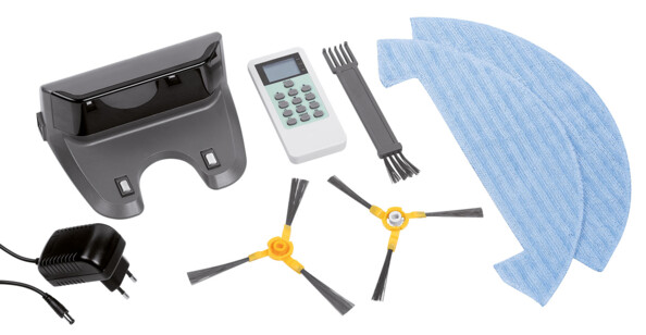 - Robot aspirateur PCR-3500, 2 brosses latérales, 2 dispositifs de lavage, (1 de rechange), réservoir d'eau, bac collecteur de poussière, télécommande, station de chargement, adaptateur secteur, pinceau de nettoyage, mode d'emploi en français