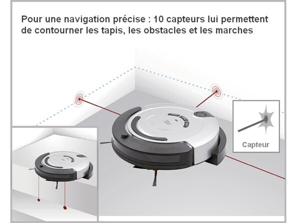 - 10 capteurs pour empêcher les collisions (murs et meubles) et les chutes (escalier)