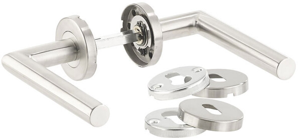- Lot de 2 garnitures comprenant chacun 2 poignées, 2 rosaces de béquille à clipser, 1 carré, 2 sous-rosaces, 2 rosaces de clé et le matériel de montage