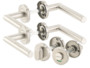 - Chaque garniture comprend 2 poignées de porte, 2 rosaces à clipser, 1 verrou, 1 rosace pour verrou, 1 carré et le matériel de montage