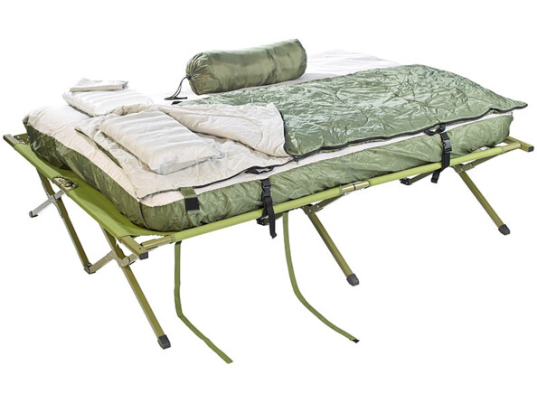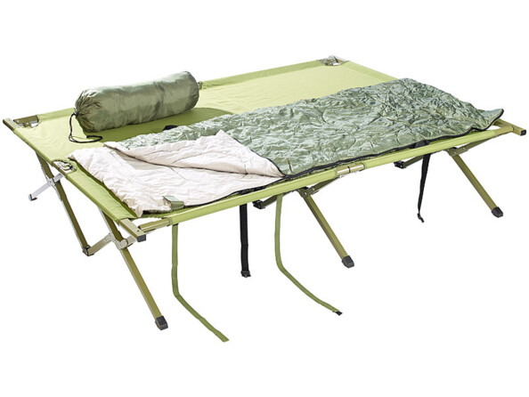 Tente 2 places avec sac de couchage, oreillers, matelas et lit de camp