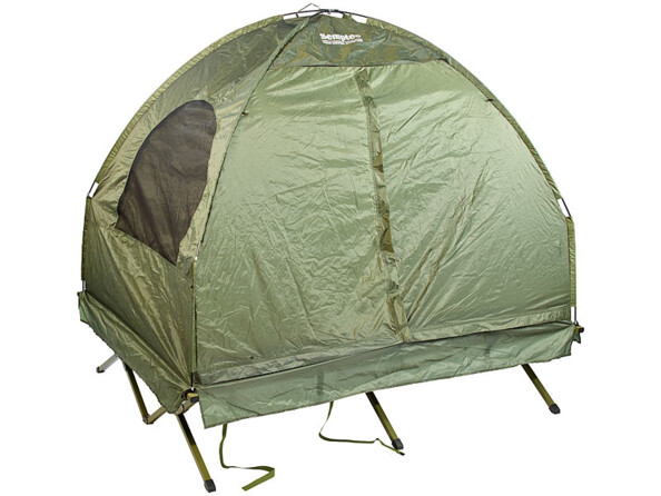 Installez la tente en un rien de temps au-dessus du lit. Vous pouvez même utiliser la tente sans emporter le lit de camp, pour des bagages plus légers et un confort presque équivalent. La couleur verte de la toile se fond dans la nature et le polyester robuste empêche l'eau d'entrer. Vous pouvez dormir tranquillement, bercé par le son de la pluie.