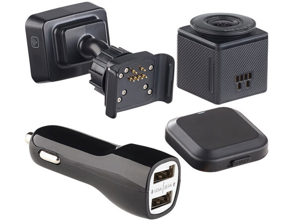 - Alimentation : par câble Micro-USB (câble USB et chargeur USB allume-cigare fournis) ou par batterie li-po intégrée (180 mAh, jusqu'à 20 minutes d'enregistrement).