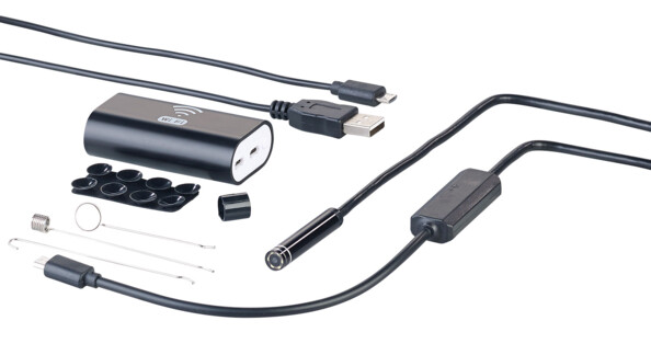 - Caméra endoscopique avec adaptateur wifi, accessoires (crochet, miroir, aimant), patch adhésif avec ventouse