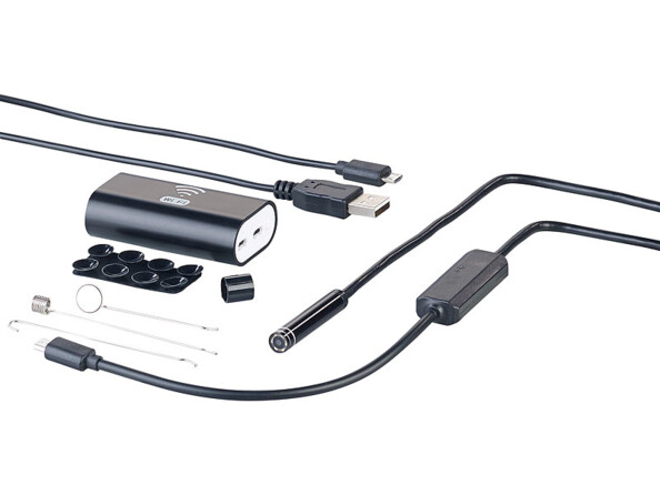 - Caméra endoscopique avec adaptateur wifi, accessoires (crochet, miroir, aimant), patch adhésif avec ventouse