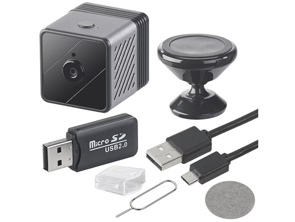 - Contenu : micro caméra de surveillance, support magnétique, câble d'alimentation USB, aiguille de réinitialisation, lecteur de carte USB, mode d'emploi