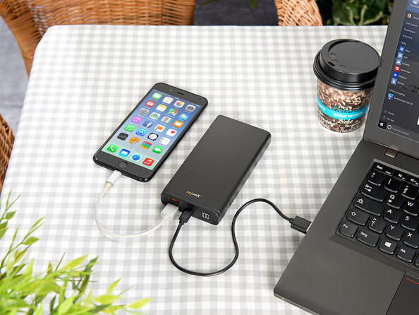 Vous pouvez même recharger jusqu'à trois appareils simultanément. Avec jusqu'à 18 W de puissance totale, vous disposez d'une source d'alimentation très efficace. Par exemple, vous pouvez alimenter votre smartphone, votre liseuse et votre MacBook en même temps même sans prise de courant à proximité.