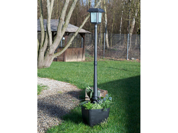 Ce pot de fleurs en plastique résistant aux intempéries maintient votre lampadaire de jardin SWL de Lunartec tout en accueillant vos plantes.