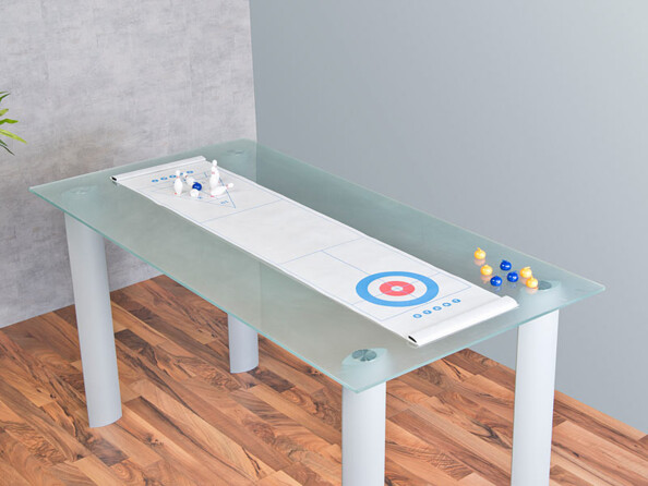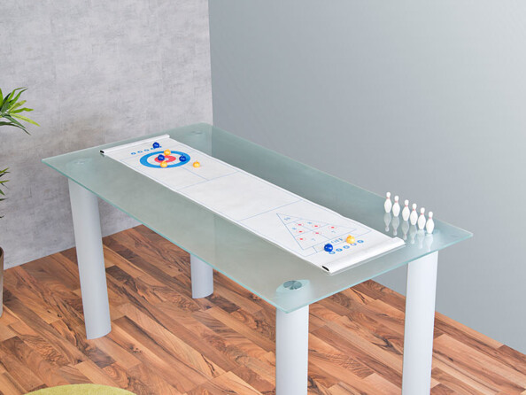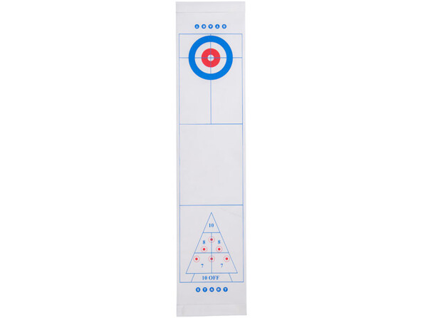 Faites glisser vos pions sur le tapis comme des pierres de curling. Visez les quilles et tentez le strike. Et initiez-vous au shuffleboard ou "jeu de palets". Le tapis comporte tous les marquages nécessaires pour jouer successivement au curling, au bowling et au shuffleboard. Même les pions et quilles sont fournis. Il ne manque plus que des participants enthousiastes.