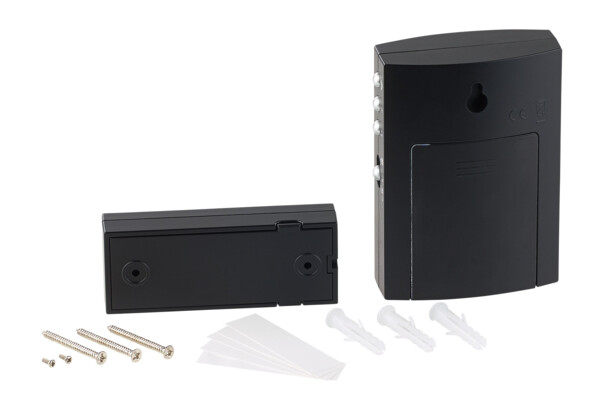 - Alimentation électrique de la sonnette de porte (émetteur) : 1 pile de type CR2032 (incluse), station de base (récepteur) : 2 piles de type AA / Mignon chacune (à commander séparément
