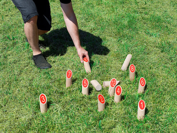 Les cônes portant des numéros sont disposés en rangées. Chaque joueur lance à tour de rôle un bâton sur les quilles pour les faire tomber. Chaque quille renversée rapporte le nombre de points correspondant au nombre inscrit dessus (pour 1 quille tombée), ou le nombre de points correspondant au nombre de quilles tombées. Le vainqueur est le premier qui atteint exactement 50 points. Mais attention, pas un point de plus, ou c'est le retour à un score de 25 points ! Très vite, petits et grands se prennent au jeu !