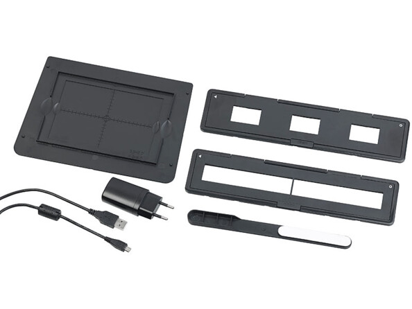 - Scanner, support pour diapositives, support pour film négatif, plaque avec porte-photo, batterie, adaptateur secteur USB, câble USB, brosse de nettoyage, mode d'emploi en français