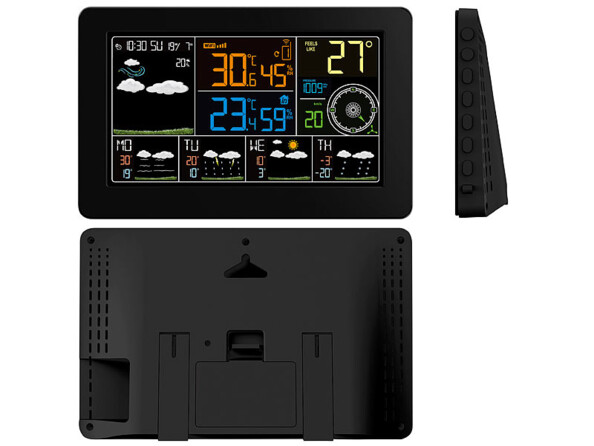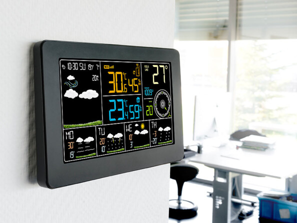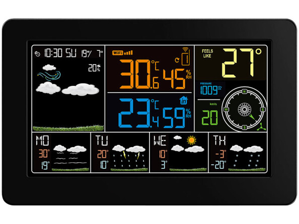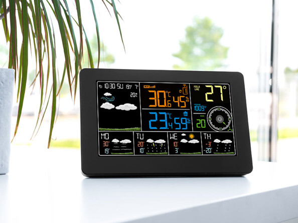 Son grand écran couleur vous indique les températures intérieures et extérieures, l'humidité de l'air, la pression atmosphérique et même la température ressentie ! Vous savez ainsi à quoi vous attendre avant même de sortir de sous votre couette. Enfin, la station indique les tendances météorologiques pour les 5 prochains jours.
