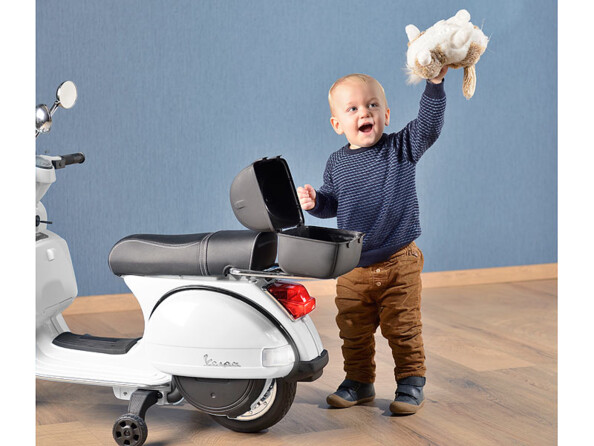 Le scooter électrique pour enfant EKM-300 est un engin au design authentique de Vespa, qui enthousiasmera les petits motards en herbe grâce à sa vitesse de pointe de 4 km/h !